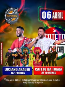 No sábado teremos no bar do Marcelinho, localizado na Rua Abdon Made, conjunto Eldorado, por trás da delegacia da mulher. Serão 4 horas de muito toada, alegria e aquela cerveja gelada. E para iniciar a festa teremos a presença especial do cantor Luciano Araújo, revelação do boi garantido na capital.